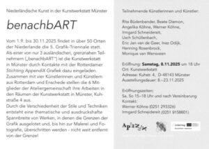 In Vorbereitung: „benachbART“, Ausstellung der Kunstwerkstatt mit vier niederländischen Künstlerinnen und Künstlern der Gruppe „AppendiX“ aus Rotterdam/Enschede. Vernissage am 8.11.25 in der KUNSTWERKSTATT, Kuhstrasse 4 ,48143 Münster, 18.00 Uhr